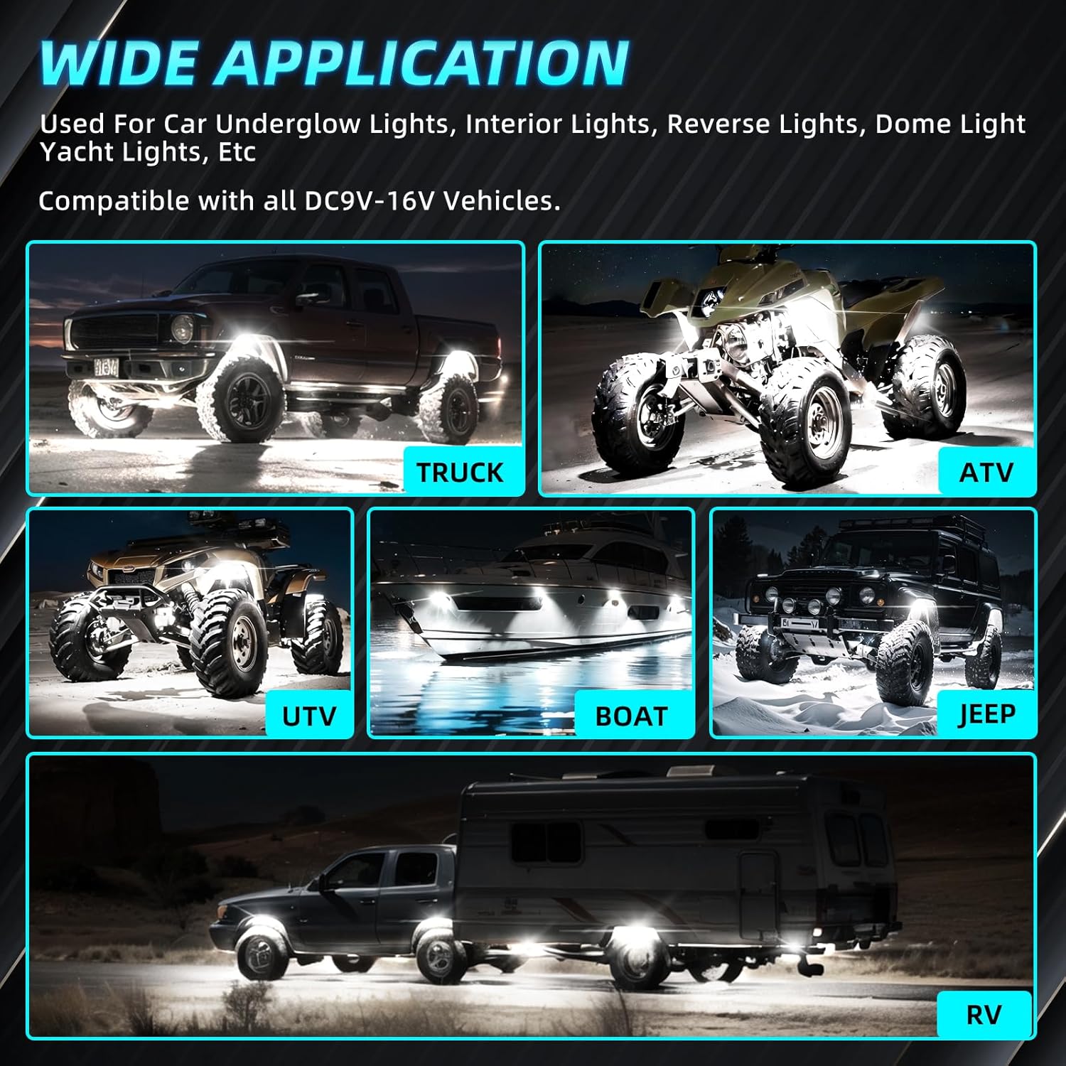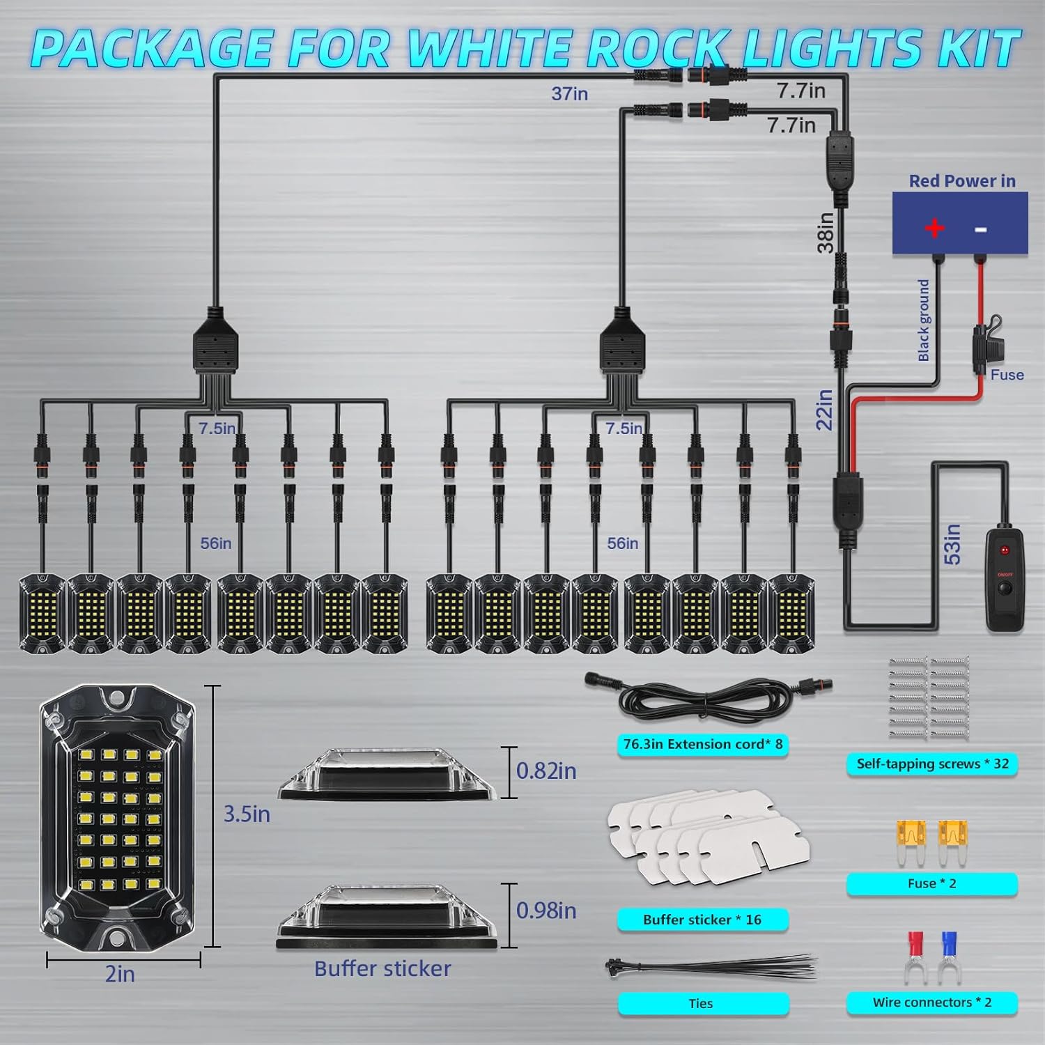 | Included Components | Full Angle Pure White LED Rock Lights*16, 8-Way Splitter *2, Y-Way Splitter *1, 78inch Extension wire*8, Power kill Switch*1, Install foam pads*16, Instruction Manual*1, Installation tools(Ties, Fuse, Self-tapping screws, Wire connectors) |