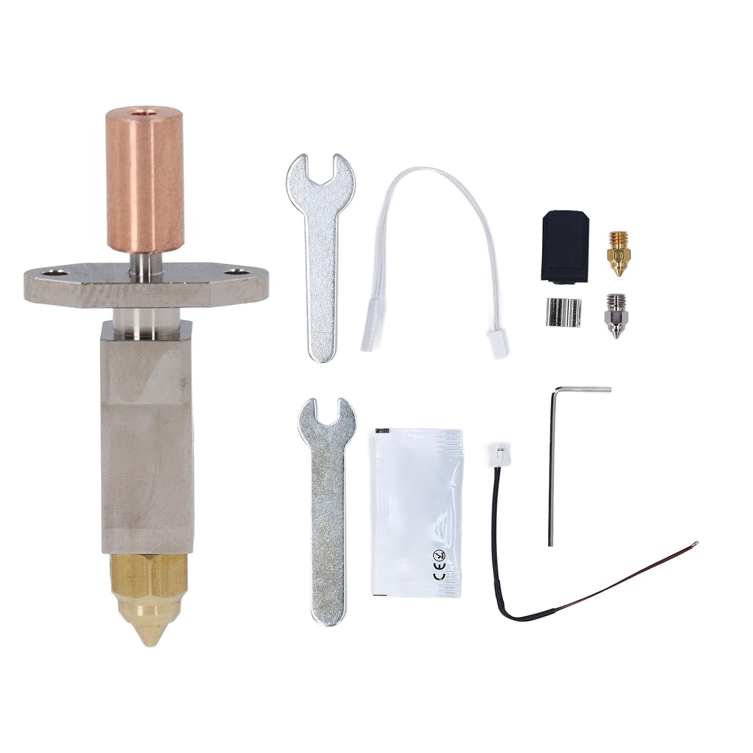 [Easy Installation] With a compact design and modular connectors, this extruder hot end kit eliminates the need for complex wiring, making it effortless to install on a 3d printer.[Anti-clogging Function] Featuring advanced heat dissipation technology, this 3d printer extruder hot end kit prevents potential clogging and ensures a seamless feed.[Premium Materials] This hot end kit is crafted from brass, copper plated, ceramic, and metal, ensuring longevity and resistance to abrasion.[Smooth Filament ] The specially designed ceramic heater block in this 3d printer hot end kit ensures even heating and smooth filament , ideal for high-speed printing.[High Temperature Resistance] The printer hotend heater block kit can withstand temperatures up to 500 °c, guaranteeing smooth filament extrusion for precise prints.Spec:Item Type: 3D Printer Hot End KitNozzle Size: Approx. 0.4mm / 0.02inNozzle Material: Brass, Copper PlatedMaterials: Brass,Copper Plated, Ceramic, MetalSupport Filament Diameter: Approx. 1.75mm / 0.07inCompatible : For K1, For K1 , For Ender 3 V3 KE, For CR10 SECompatible Materials: PLA, ABS, PETG, TPU, PP, PC, Nylon etc.Package List:1 x Hotend2 x 0.4mm Nozzles1 x Ceramic Heating Plate1 x Thermal Wire1 x Fixing Clamp1 x Silicone Sleeve1 x Thermal Conductive Grease1 x 1.5mm Hex Wrench2 x 4mm Open End WrenchesHow To Use:Install and use directly.