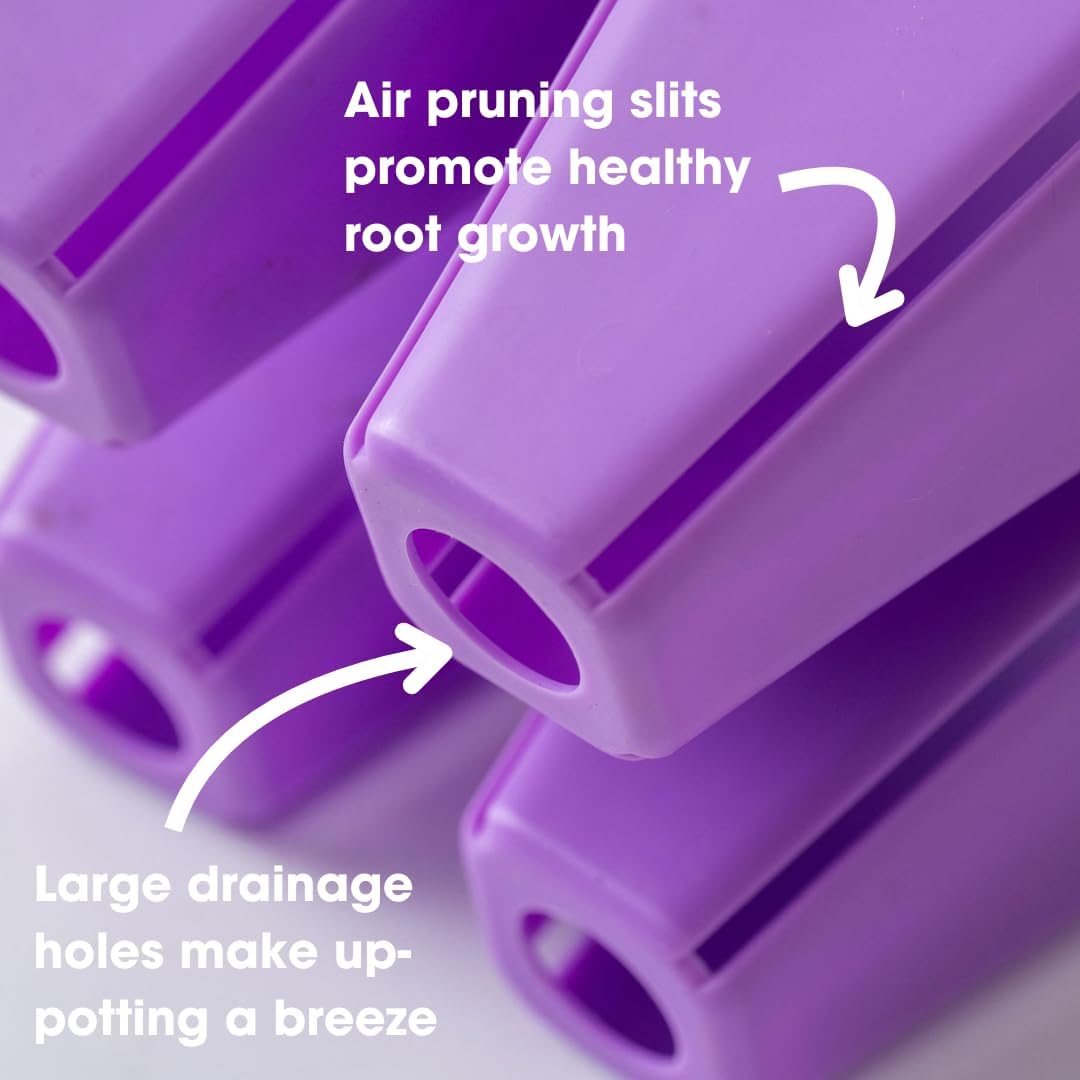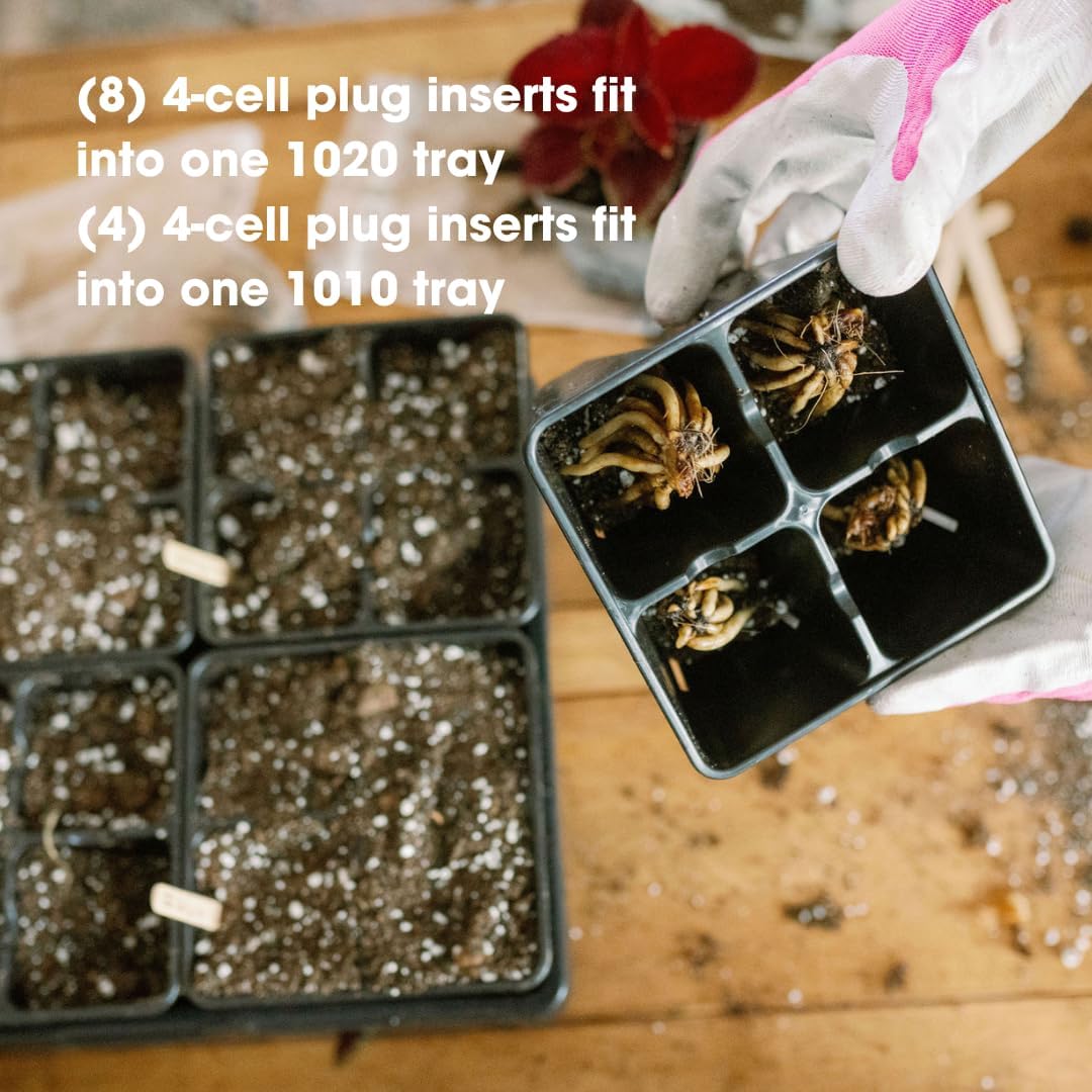 Proudly made in the USA, these larger 4-cell plug inserts are deeper for growing varieties of crops that need a little more room. Eight of these removable inserts fit in a Bootstrap Farmer 1020 tray. Made out of food-safe, heavy-duty polypropylene plastic and built to last many seasons. Designed with Air Prune technology. Air channels are added on each side to prevent root circling. Air-pruned roots are shown to provide healthier and more vigorous growth. Color code your seedlings in these insert plug trays - available in black, blue, green, purple, pink, orange, and multi-color packs.