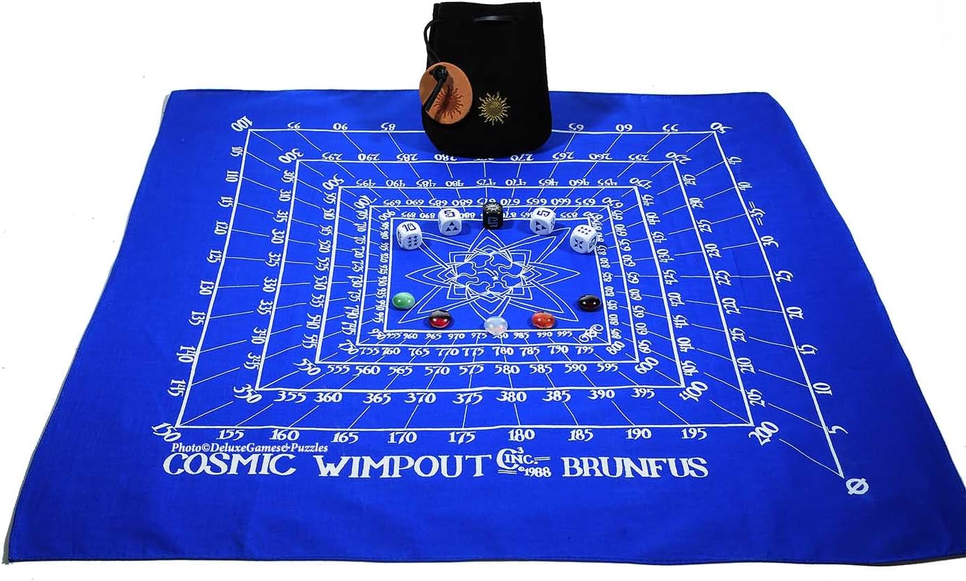 Cosmic Wimpout is a lot like life. Sometimes you are in the Cosmic Flow and sometimes you Wimp Out. Cosmic Wimpout is played with 5 specially designed cubes. Players need to balance between greed and prudence. Various roles of the dice allow players to score. Anytime the cubes are cast and NO numbers, Flashes or Freight Trains come up you've WIMPED OUT. All points accumulated during that turn are lost forever (into the Cosmic Netherworld). Deluxe Travelin' Cosmic Wimpout includes 5 dice, 24 x 24 inch Blue Cloth Scoreboard, leather drawstring pouch and 5 bonus glass gemstones for scorekeeping. NOTE: Blue Game Scoring Cloth comes in Assorted designs. Graphic designs can differ from photo. Manufacturer ships graphic designs at random.
