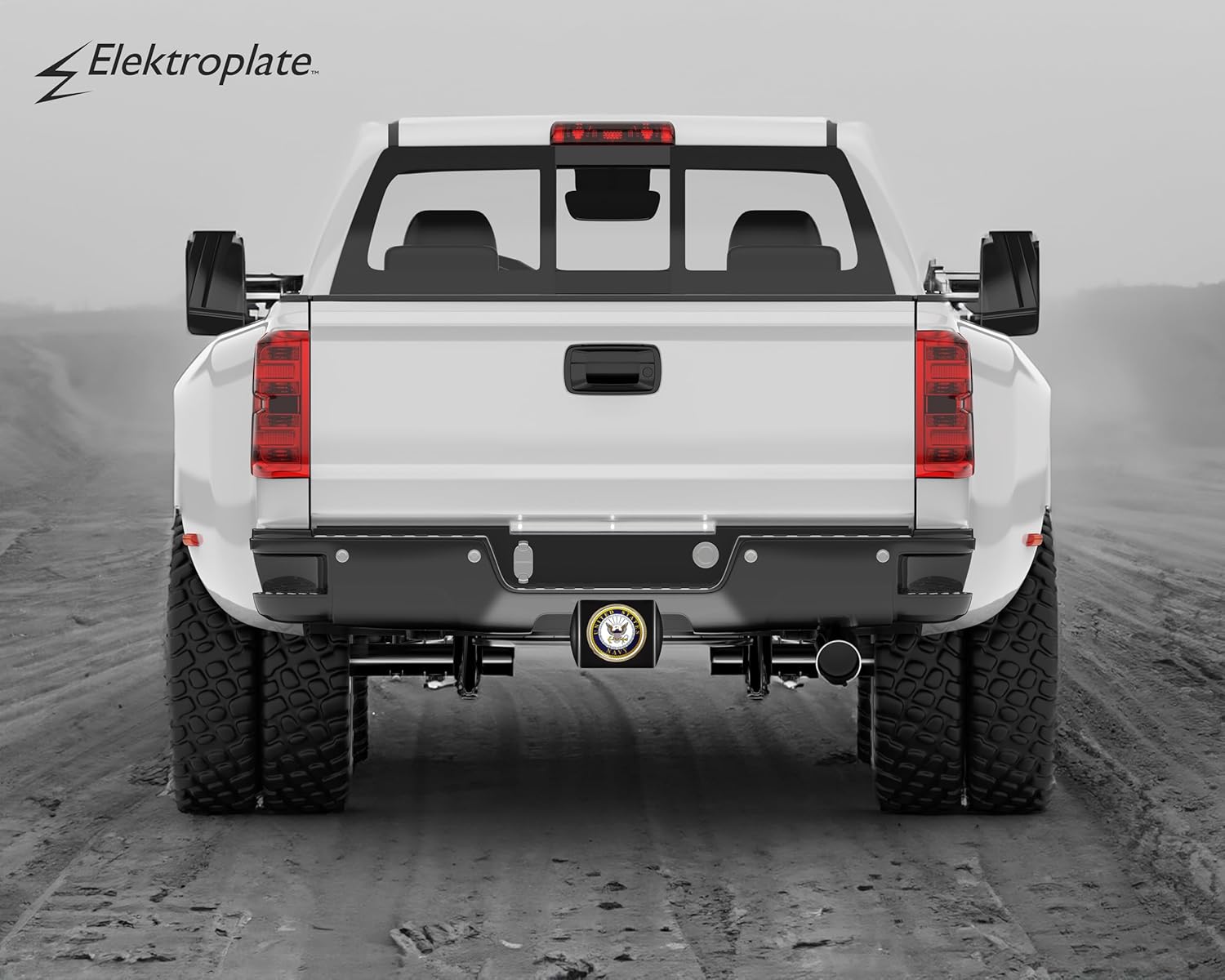 Show your pride for the United States Navy with this high-quality all metal black hitch cover featuring the iconic Navy eagle emblem. The sleek design adds a bold, patriotic touch to your vehicle. Crafted with durable materials, this black powder coated hitch cover (5.0" x 3.5") protects your vehicle's trailer hitch from the elements, ensuring it stays in pristine condition. The cover's standard 2" trailer hitch receiver fit prevents dirt, debris, and moisture from accumulating inside the hitch receiver, prolonging its lifespan and ensuring smooth towing. Whether you're heading to a campsite or transporting gear, this hitch cover keeps your equipment secure and your vehicle looking sharp. Show your allegiance to the United States Navy with this striking emblem wherever you go.