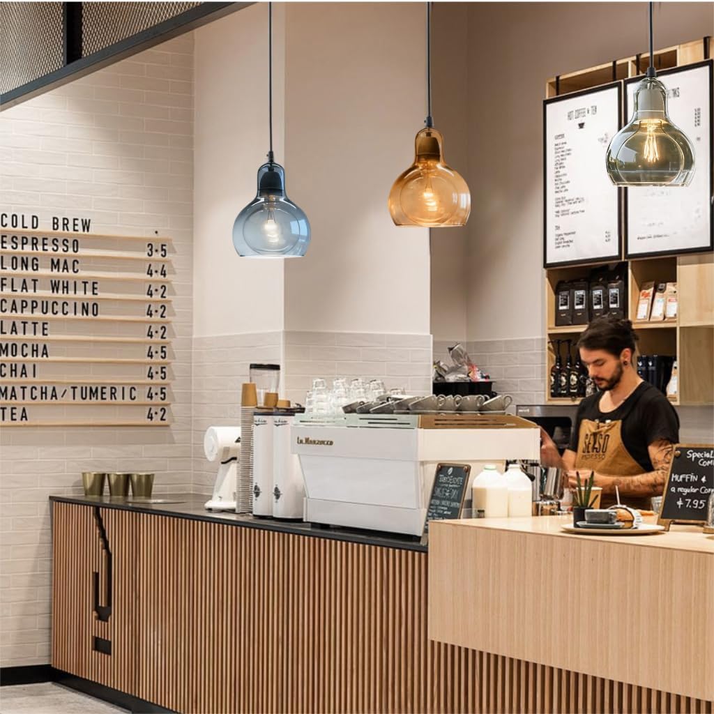 Modern Glass Pendant LightThis modern glass pendant light combines sleek design with functional lighting. With options in amber, clear, and smoke gray, it offers a stylish solution for modern interiors, adding sophistication to your space.Made from high-quality metal and glass, this pendant light guarantees durability and excellent lighting performance. The adjustable 150 cm cable allows you to customize the hanging height, making it perfect for both low and high ceilings.This pendant light is compatible with E27/E26 base bulbs, giving you the freedom to choose your preferred light source. You can use LED bulbs for energy efficiency or incandescent bulbs for a warm ambiance. Please note, bulbs are not included.Installation is quick and easy, as the light is designed to be hardwired and comes with a complete installation kit. It is compatible with flat, sloped, or vaulted ceilings, making it a versatile lighting solution for any room. Perfect for living rooms, bedrooms, kitchens, dining rooms, and offices.