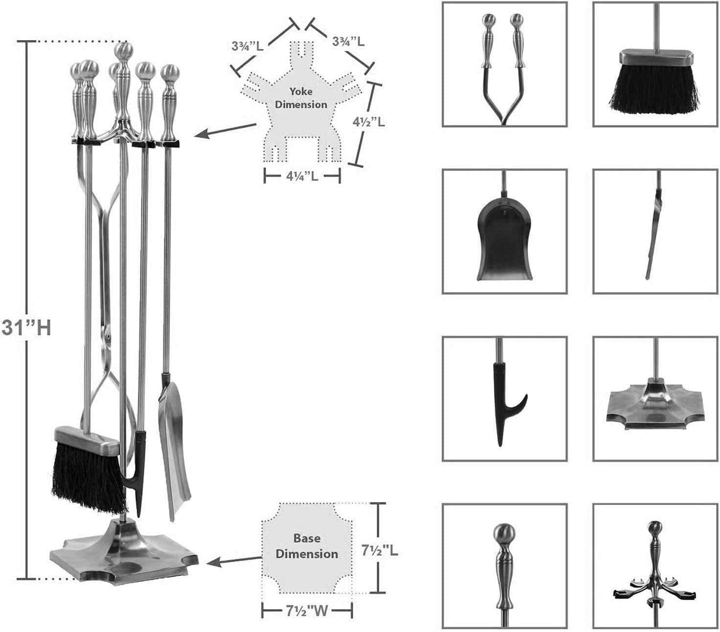 This fireplace tool set is more than a tool but also a decoration to your house because of its aesthetic design. It coordinates with most fire screens log holders and racks or outdoor fire pit tools; the robust design is stylish for both modern home decoration and country fireplaces! Package contents: 1 × Center stand; 1 × Brush; 1 × Shovel; 1 × Poker; 1 × Tongs. 【 Specification 】: Material: Metal. Wrought iron Overall Dimensions: 19 cm × 19 cm × 79 cm/8" × 8" × 31" Color: Gold 【 Feature 】: Ergonomic design handles. The top support keeps your tools organized last you a lifetime. Medium soft brush bristles. Hard enough to clear soot but not hard enough to scratch anything. The long enough design does not burn fingers while flipping logs. Stylish look adds a modern touch to the interior design of your house or business. Easy to assembly. 【 Notice 】: Do not leave the tool in the fire for a long time it will eventually become hot. It doesn't matter if it smells just leave it alone under ventilated place.