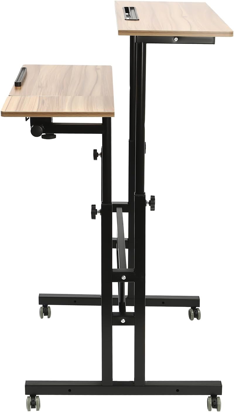 Specification:Material: MDF, Carbon SteelColor: Iron-BrownProcess: Melamine Paper Lamination, Electrostatic SprayingStyle: ModernShape: RectangularAssembly Required: YesDesk Design: Writing DeskMounting Type: FreestandingGross Weight: 11kg/ 24.25 lbs Net Weight: 10kg/ 22.05 lbsMaximum Load Capacity (Each Desktop): 19.96kg/44lbsBack Desk Size: 70*30.5*72.4-126cm/27.5*12*28.5-49.5inFront Desk Size: 70*30.5*72.4-117cm/27.5*12*28.5-46inStopper Length: 34.3cm/13.5inPackage Size: 89*65*10.5cm/ 35.04*25.59*4.13inPackage Included:1 * Mobile Stand-Up Desk1 * English ManualAll Accessories for InstallationNotes:1. After the table body is elevated, there will inevitably be a little shaking under the action of external forces. You can try to place the product next to the wall to improve the situation. If you mind it, please be careful about buying! 2. Please allow the slight color difference caused by the shooting light and the 1-3 cm error due to manual measurement, and make sure you do not mind before ordering.