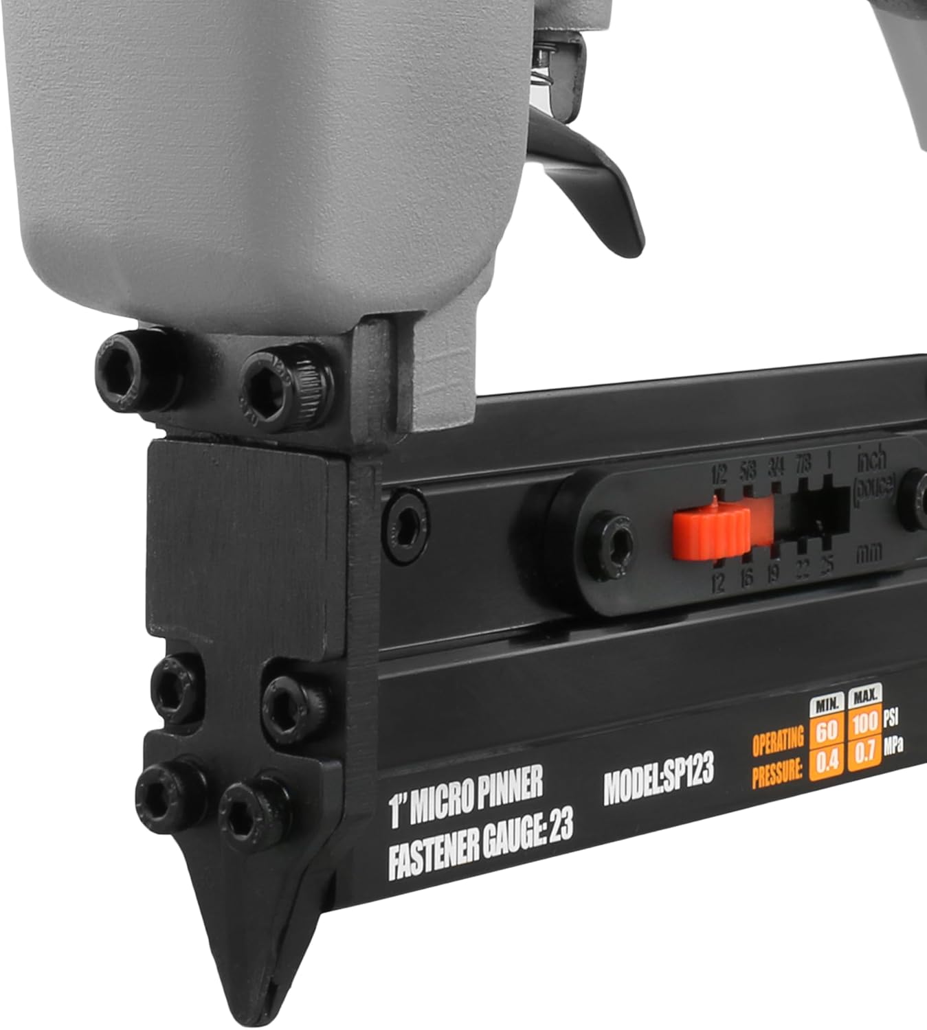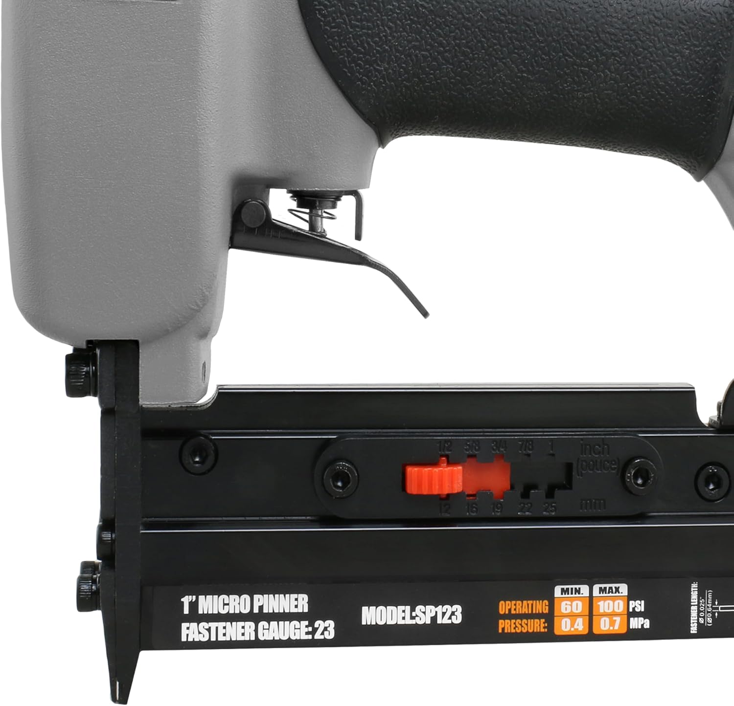 Product Description The NuMax SP123 Pneumatic 23-Gauge 1" Micro Pin Nailer is perfect for applications such as tacking decorative trim, glazing strips, small picture frames, cabinetry trim, assembling jewelry cases, and hobbies and crafts. This air powered pin nailer is compatible with 23 gauge headless micro pins from 15/32" to 1", and the bottom loading magazine makes reloading nails fast and easy. A trigger specifically designed for contact actuation ensures accurate pin placement and avoids accidental firing. Lightweight and durable die cast aluminum construction and an ergonomically engineered body create an easy to operate tool great for use over long stretches of time. A convenient comfort grip handle reduces fatigue while increasing control, helping to provide professional results for DIYers at home and construction contractors at the job site. The Pneumatic 23-Gauge 1" Micro Pin Nailer is covered by NuMax's 1 Year Limited Warranty and 30 Day Wearable Parts Warranty. From the Manufacturer The NuMax 1-Inch 23ga. Pinner takes care of all of your finishing projects, such as molding, crafts, hobbies. It has a lightweight aluminum design. This tool is manufactured under the strict guidelines for quality control. NuMax Pneumatic line of nailers was developed with the professional in mind. Our company has worked diligently to develop a product that could meet the demands of the Professional customer and still hold true to the value associated with our product and its price point. NuMax guns are sold, distributed, serviced, and warranted by a US company, Prime Global Products, Inc. PGP is proud to offer our nailers to the professional and Do-it Yourselfers alike. NuMax nail guns are backed by our 1 Year Limited Warranty. If your NuMax tool ever needs service please read our warranty policy for complete details. Please contact us with any questions regarding your NuMax Nailer at: www.NuMaxtools.com or by calling 888-669-5672.
