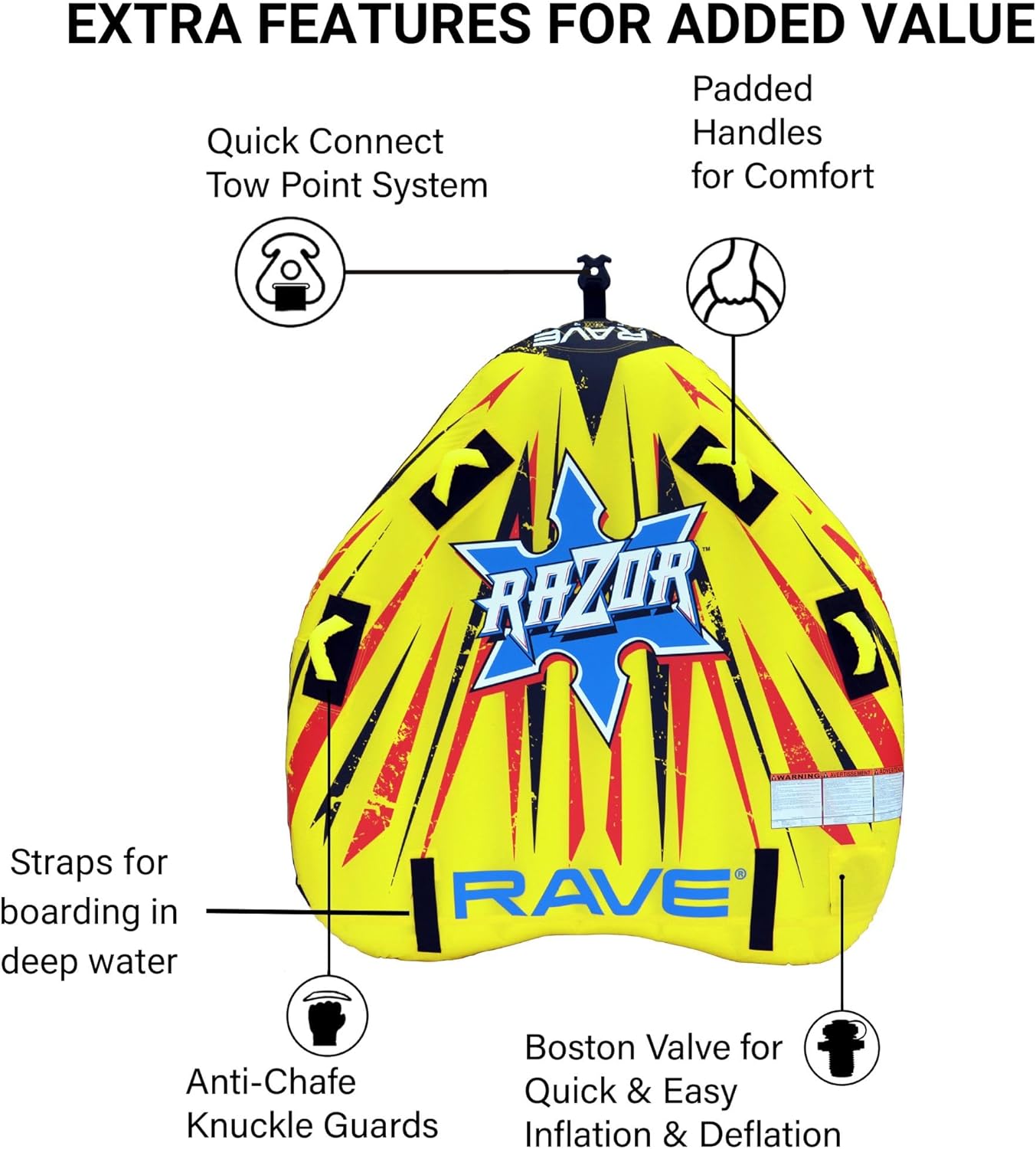 The Razor tube is easily towed by all types of watercraft, and features a rear boarding strap, low profile design for easy rider boarding and high maneuverability. This tube is ready for action with a Skim-Fast bottom that responds quickly to wakes and waves, creating a dynamic and exciting ride!