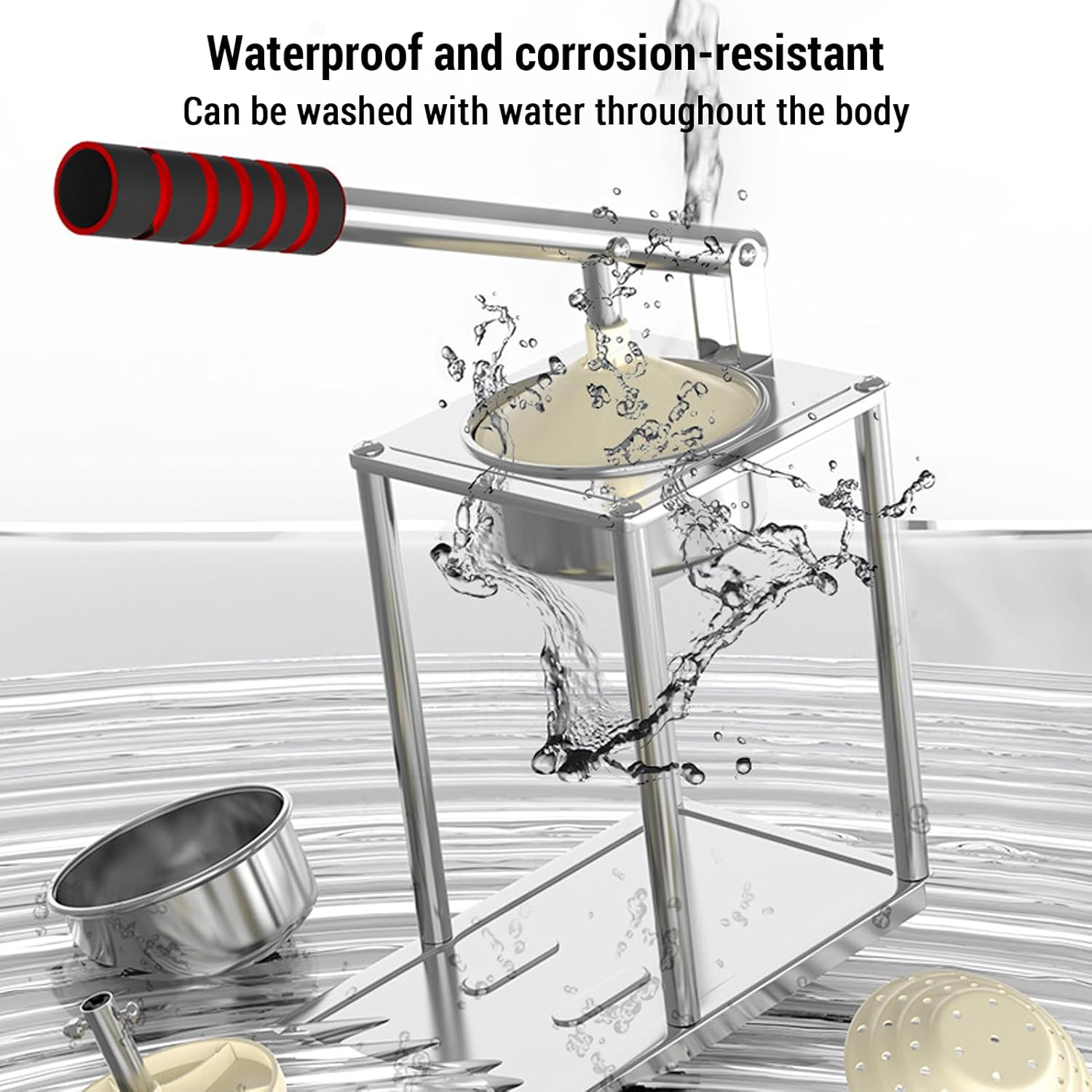 Spec: Material: 304 Stainless Steel Color: Silver Package List: 1 * r 1 * Measuring Cup 1 * Press Head 1 * Funnel 1 * Strainer 1 * Silicone Strip Note: Peel off the outer film before use, and then use the silicone edge strip to install around the r to avoid cutting