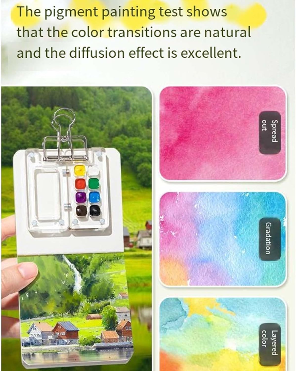 Who Is This For?🎨 Beginners – Easy-to-use, mess-free setup.✈️ Travel Artists – Compact & lightweight for on-the-go creativity.🖌️ Professionals – Reliable pigments & smooth brush control.💡 Hobbyists &– Great for journals, illustrations, and practice.Key Features:---Compact & Travel-Friendly – Fits in pockets or small bags.---High-Quality Materials – Walnut wood palette + premium brush.---Versatile Use – Ideal for landscapes, portraits, and urban sketching.---Beginner & Pro-Friendly – Easy to use yet delivers professional results.Specifications:Material: Walnut、AcrylicSize:8-color palette (approx. 2.36 x 2.36 inches)15-color palette (approx. 5.67 x 2.83 inches)Product Includes:1 * 8/15 Grid Box Mini Travel Palette with Metal Clip1 * Watercolor Pen1 * Drawing Book1* Flat-tip brush1 * 12/24 Colors of Pigments2* Wrist TowelsNotes:1.Due to the effects of light and shooting angle, the actual color of the item may differ slightly from the color shown on the picture2.Due to manual measurement, please allow minor measurement deviations