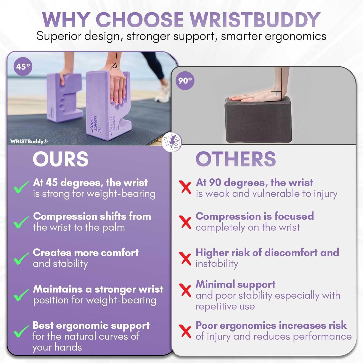 Finally, blocks that fit your hands — not just the floor. WRISTBuddy’s contoured, left- and right-hand blocks shift pressure into your palm for a safer, stronger wrist angle in weight-bearing poses. Designed by a sports chiropractor, they help practitioners with sensitive wrists, carpal-tunnel-type discomfort, prior sprains, or simply anyone who wants more comfort and control in yoga, Pilates, handstands, and push-ups. Why they’re different: ergonomic palm cutouts, textured grip, balanced EVA density, labeled L/R for instant placement. Great for: vinyasa & restorative, mobility work, PT/OT rehab, handstand practice, studio classes. What’s included: two EVA blocks (Left + Right), usage guide. FAQ Will these help with wrist pressure in down dog/planks? Yes—by moving the load toward the palm and away from the small wrist joints. Are they beginner-friendly? Absolutely, instructors use them to improve comfort, grip and alignment for all levels.