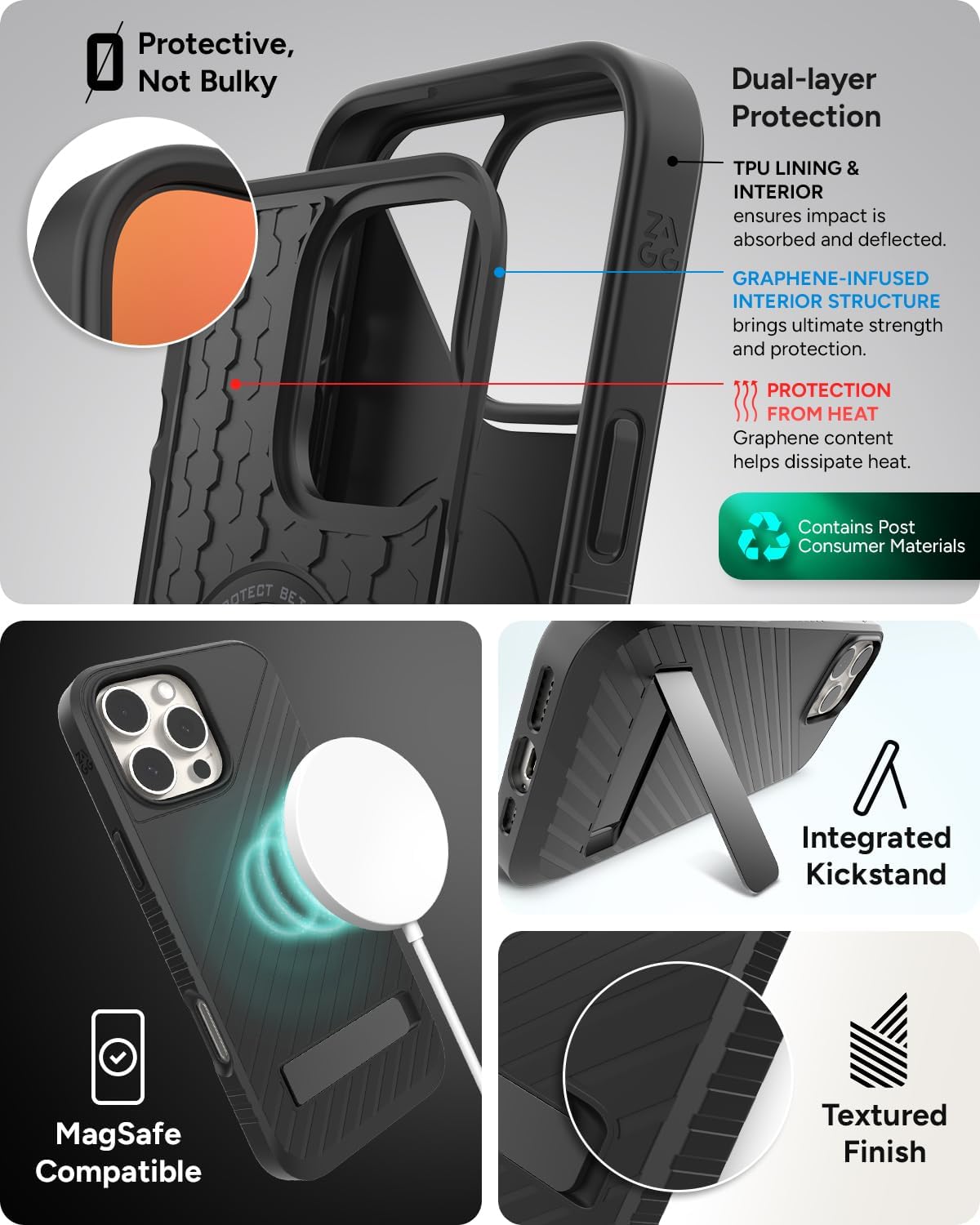 The ZAGG Denali Snap with Kickstand is designed to handle life’s toughest moments, just like the mountain it’s named after. Imagine capturing the perfect moment when your phone slips from your hand and plummets towards the ground. With military-grade protection, your phone stays safe, shielded by a case tested to survive drops from up to 16 feet, meeting Mil Std 810G 516 standards.Reinforced with graphene, this case provides superior impact protection and helps dissipate heat, ensuring your iPhone 16 Pro Max stays safe and cool even during heavy use. Known for being up to 200 times stronger than steel, graphene adds unmatched durability without adding extra bulk.The fingertip-friendly kickstand offers secure hands-free viewing, whether you're watching videos, working, or video chatting. When not in use, it folds flush with the case for a sleek, seamless look.Stay powered without extra steps. The Denali Snap is MagSafe and wireless charging compatible, allowing you to charge without removing the case, ensuring you’re always ready to go.Designed with sustainability in mind, this case is made from up to 89% recycled materials. You can protect your phone and the planet simultaneously.Protect your iPhone 16 Pro Max with the ZAGG Denali Snap with Kickstand—built for the toughest conditions and the harshest environments. Order now and experience unparalleled protection! Key Features: Tested to withstand drops from up to 16 feet, meeting Mil Std 810G 516 standardsReinforced with graphene for exceptional impact protection and heat dissipationMagSafe and wireless charging compatible, no need to remove the caseIntegrated kickstand for hands-free viewing in portrait and landscape modesMade from up to 89% recycled materials